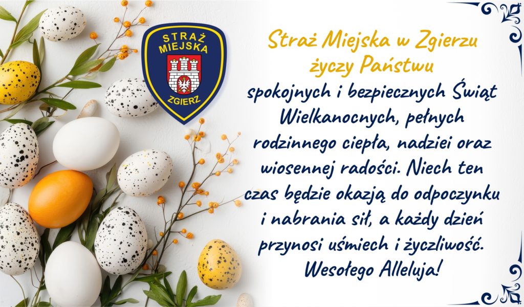 Zdrowych i pogodnych Świąt Wielkanocnych pełnych wiary, nadziei i miłości, radosnego wiosennego nastroju, serdecznych spotkań w gronie rodzinnym, oraz wesołego „Alleluja”, życzą strażnicy miejscy i pracownicy Straży Miejskiej w Zgierzu.